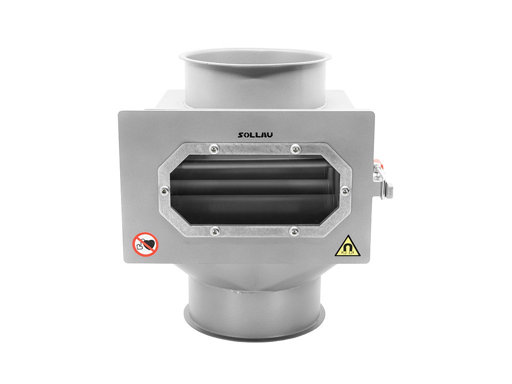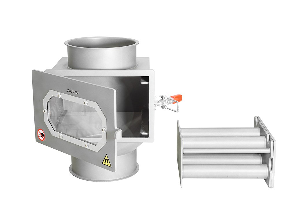 Magnetický skříňový separátor umožňuje snadné a rychlé oddělení magnetických kovových nečistot od čištěného produktu a chrání před poškozením stroje a zařízení, které následně vyčištěný materiál zpracovávají. Základ magnetického skříňového separátoru tvoří jeden nebo dva výsuvné magnetické rošty z nerezové oceli, kterými propadá čištěný práškový materiál. Velmi silné magnetické pole, generované neodymovými magnety uvnitř trubic roštů, zachycuje feromagnetické částice na povrchu roštů. V případě MSS-MC jde o klasickou konstrukci, kdy jsou magnetické rošty vůči vstupním dvířkám uloženy napříč. Díky průhledovému kontrolnímu okénku je možno průběžně kontrolovat tok materiálu a stav znečištění trubic. Při čištění se rošty vytáhnou ze separátoru a lze je snadno a rychle vyčistit, neboť po manuálním vysunutí magnetických jader z nerezových trubic feromagnetické nečistoty z povrchu trubic roštu samovolně odpadnou.